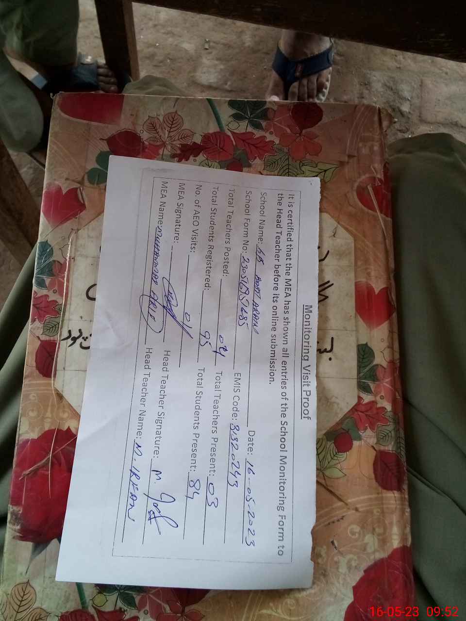 | Attendance Register | Head Teacher | MEA with School | Visit Proof |