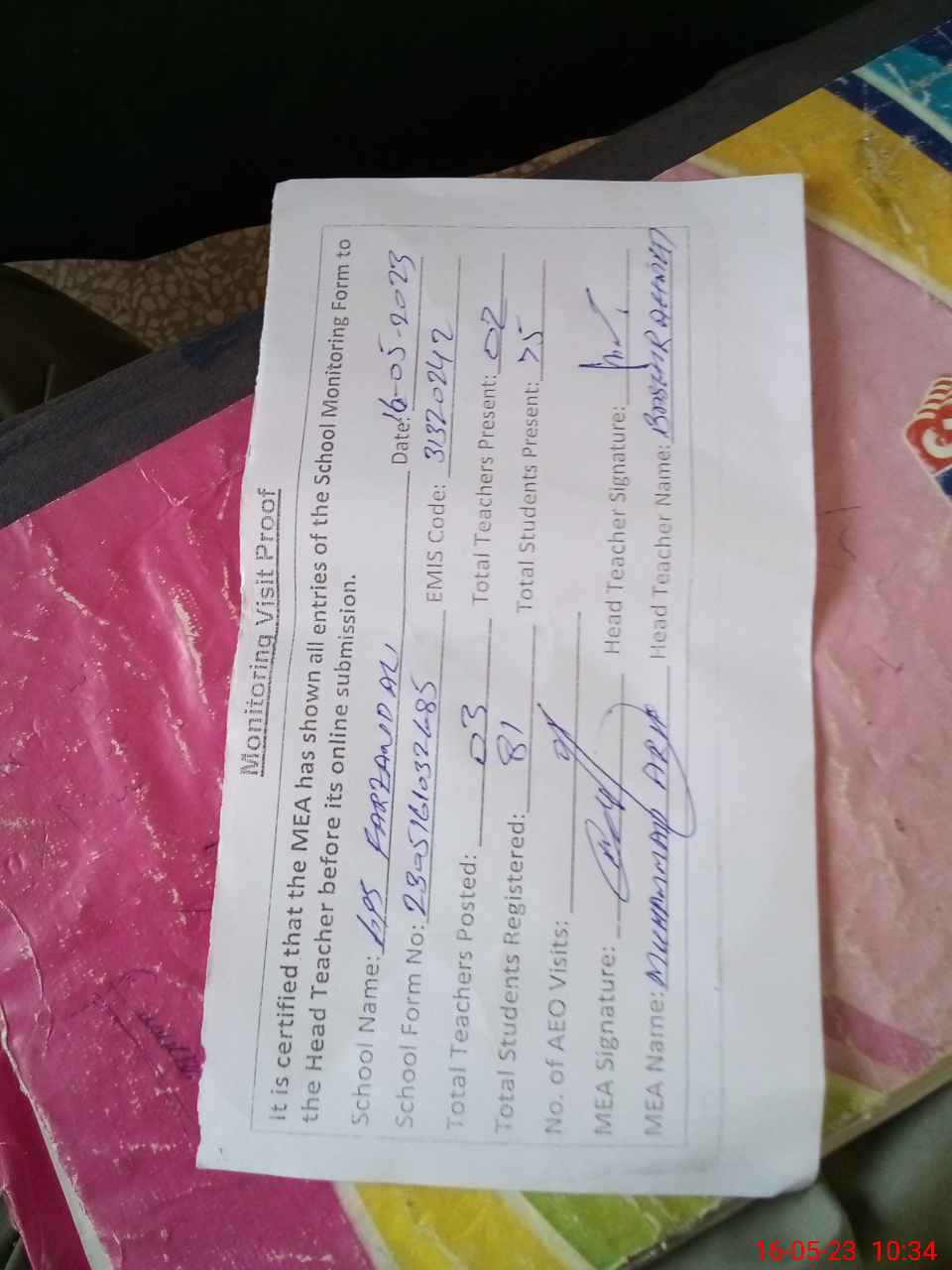 | Attendance Register | Head Teacher | MEA with School | Visit Proof |