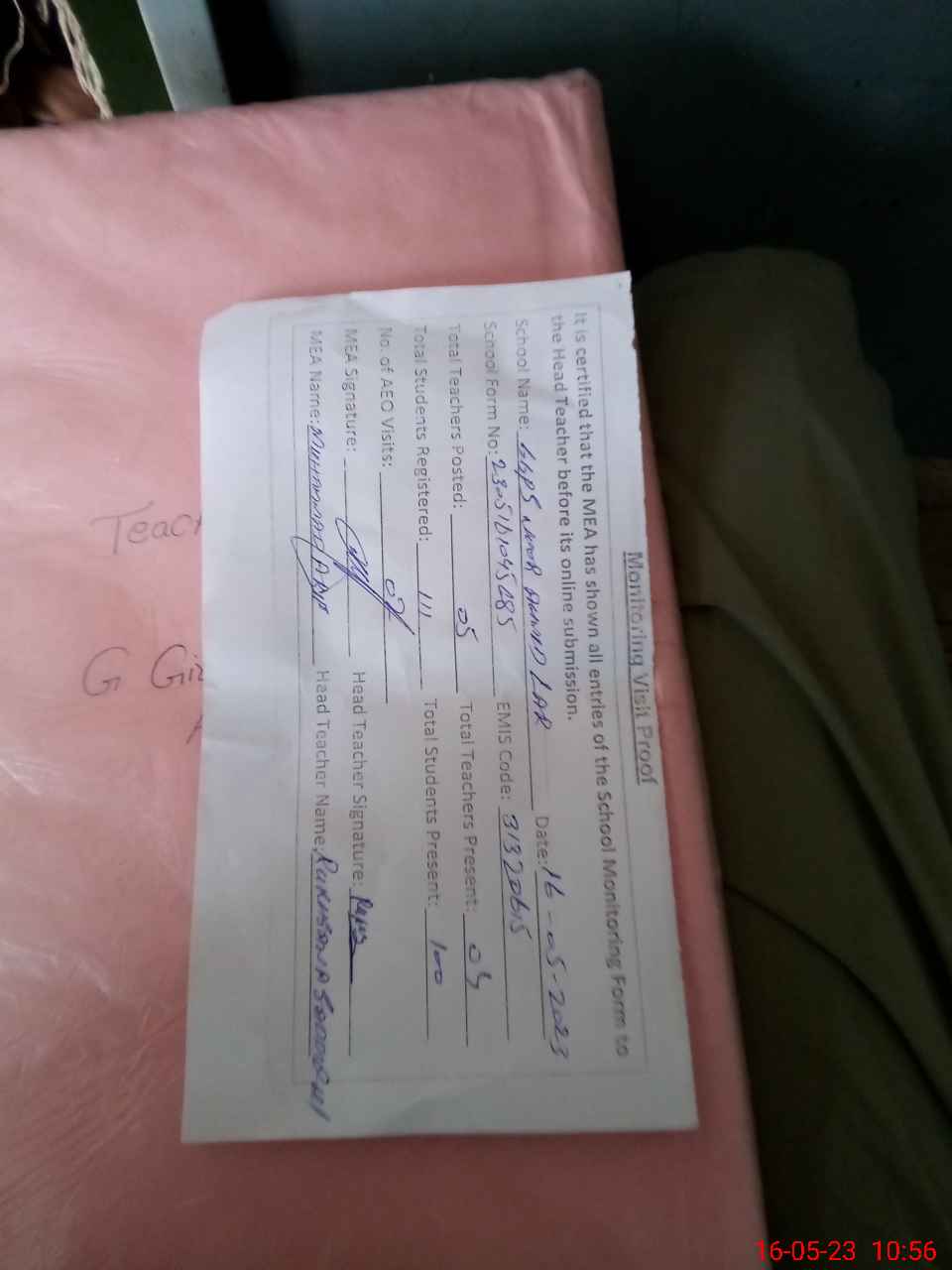 | Attendance Register | Head Teacher | MEA with School | Visit Proof |