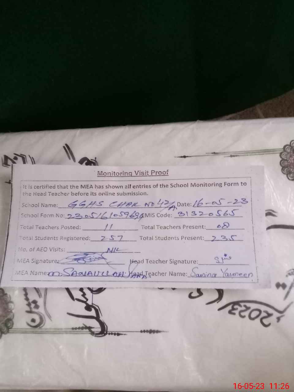 | Monitoring Date: 16-05-2023 | Start Time: 16-05-2023 10:59 AM | End Time: 16-05-2023 11:26 AM | Name of MEA: Mu**** Sa**** Ul**** Sa**** | |