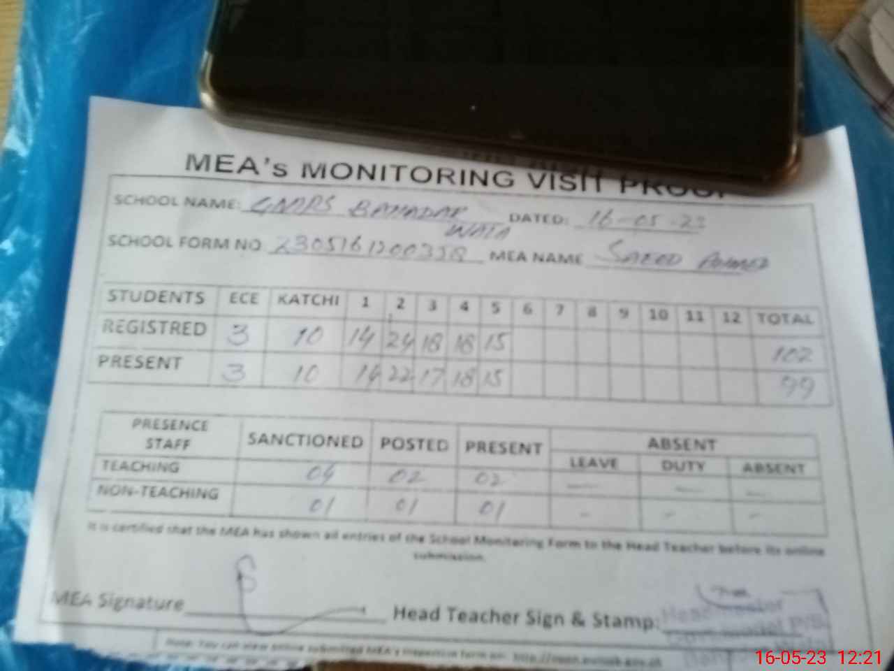 | Attendance Register | Head Teacher | MEA with School | Visit Proof |