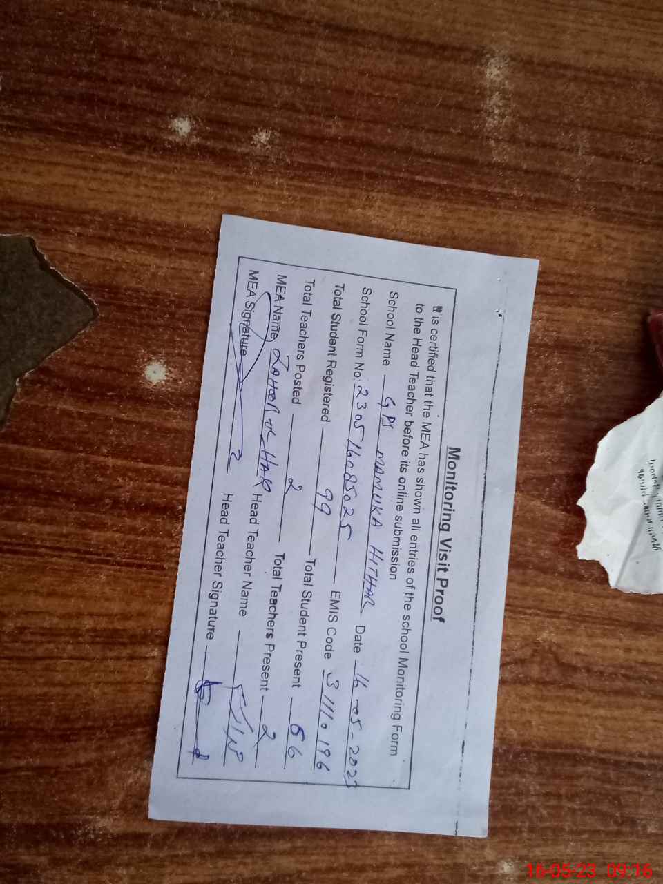 | Attendance Register | Head Teacher | MEA with School | Visit Proof |