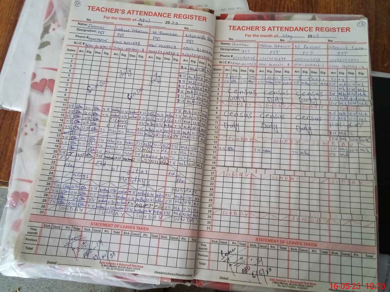 | CNIC | Full Name | Designation | R/C | Absence During Last Calender Month |