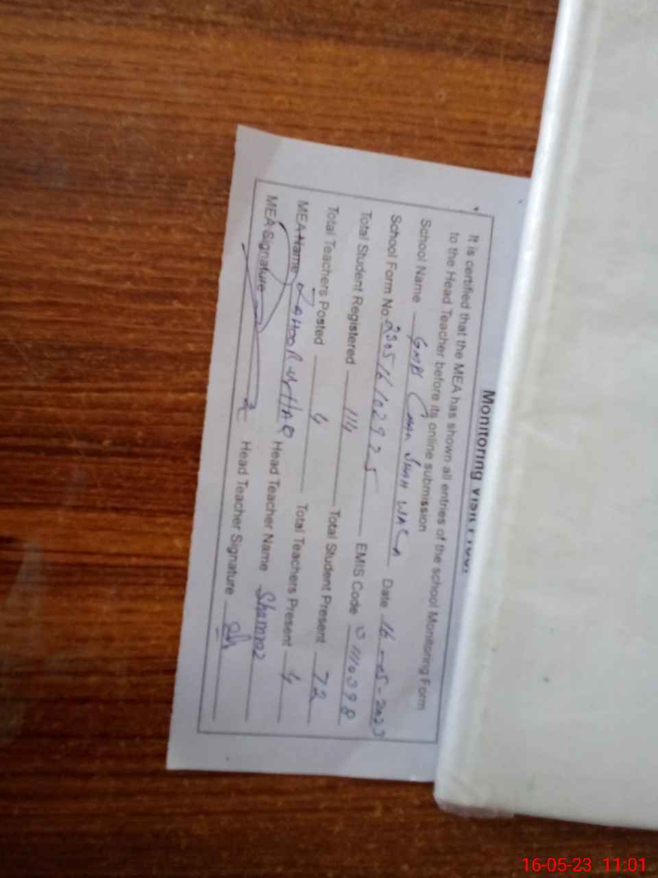 | Attendance Register | Head Teacher | MEA with School | Visit Proof |