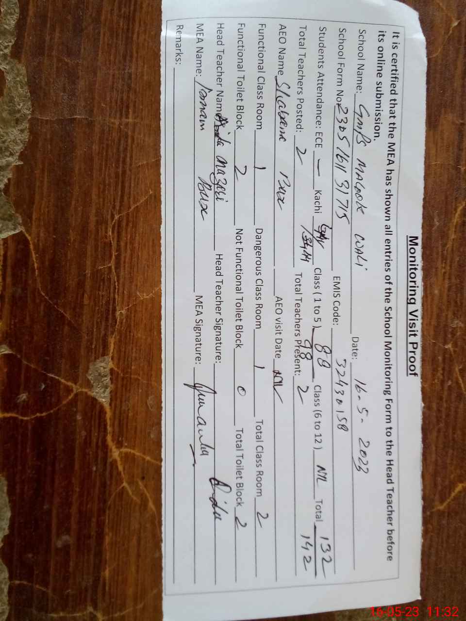 | Attendance Register | Head Teacher | MEA with School | Visit Proof |