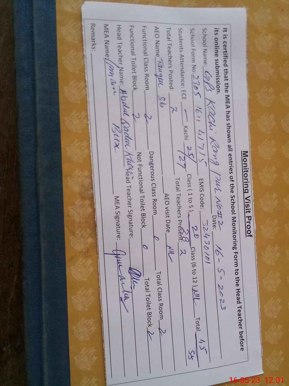 | Attendance Register | Head Teacher | MEA with School | Visit Proof |