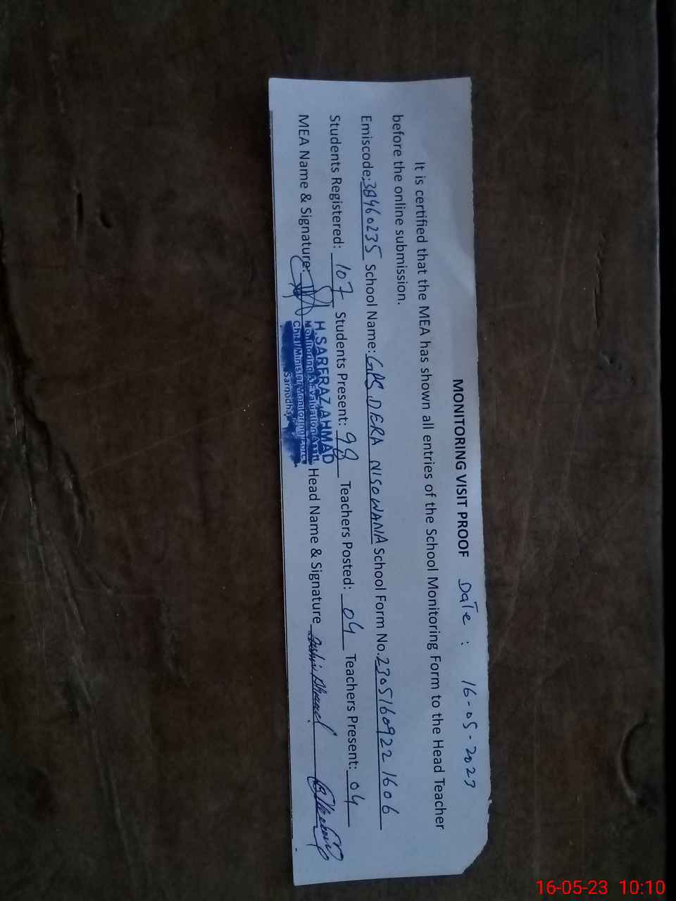 | Attendance Register | Head Teacher | MEA with School | Visit Proof |