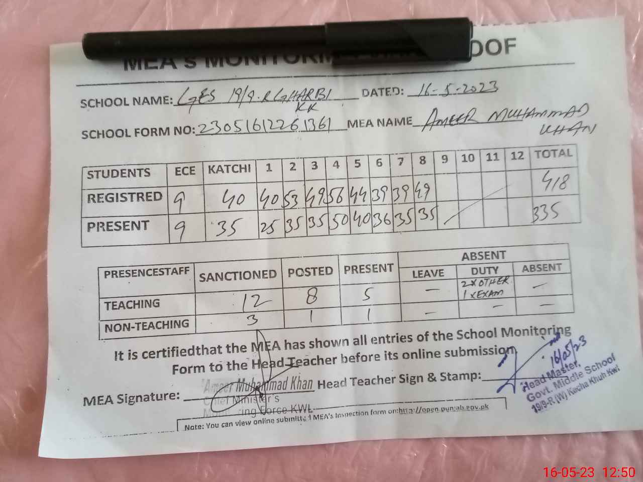 | Attendance Register | Head Teacher | MEA with School | Visit Proof |