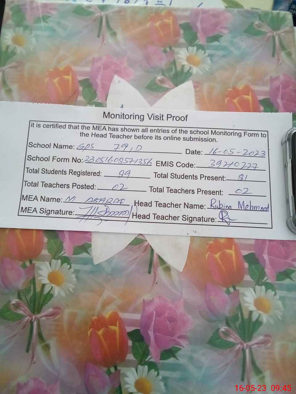 | Attendance Register | Head Teacher | MEA with School | Visit Proof |