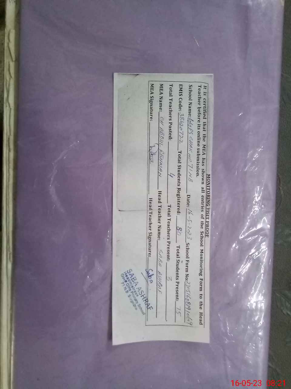 | Attendance Register | Head Teacher | MEA with School | Visit Proof |
