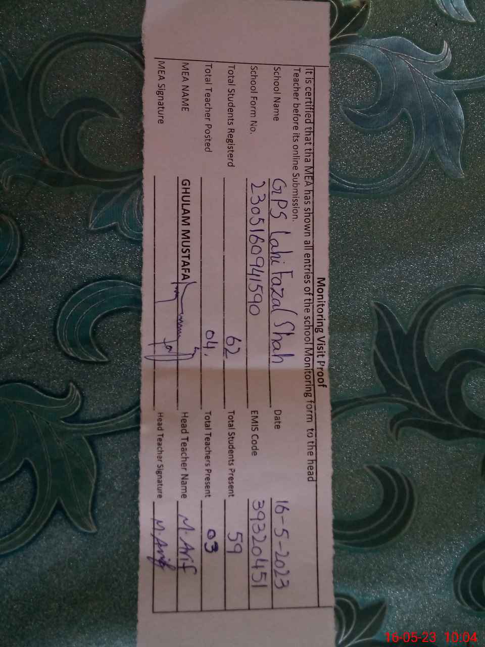 | EMIS Code: 39320451 | Name of School: GPS LAHI FAZAL SHAH | |||