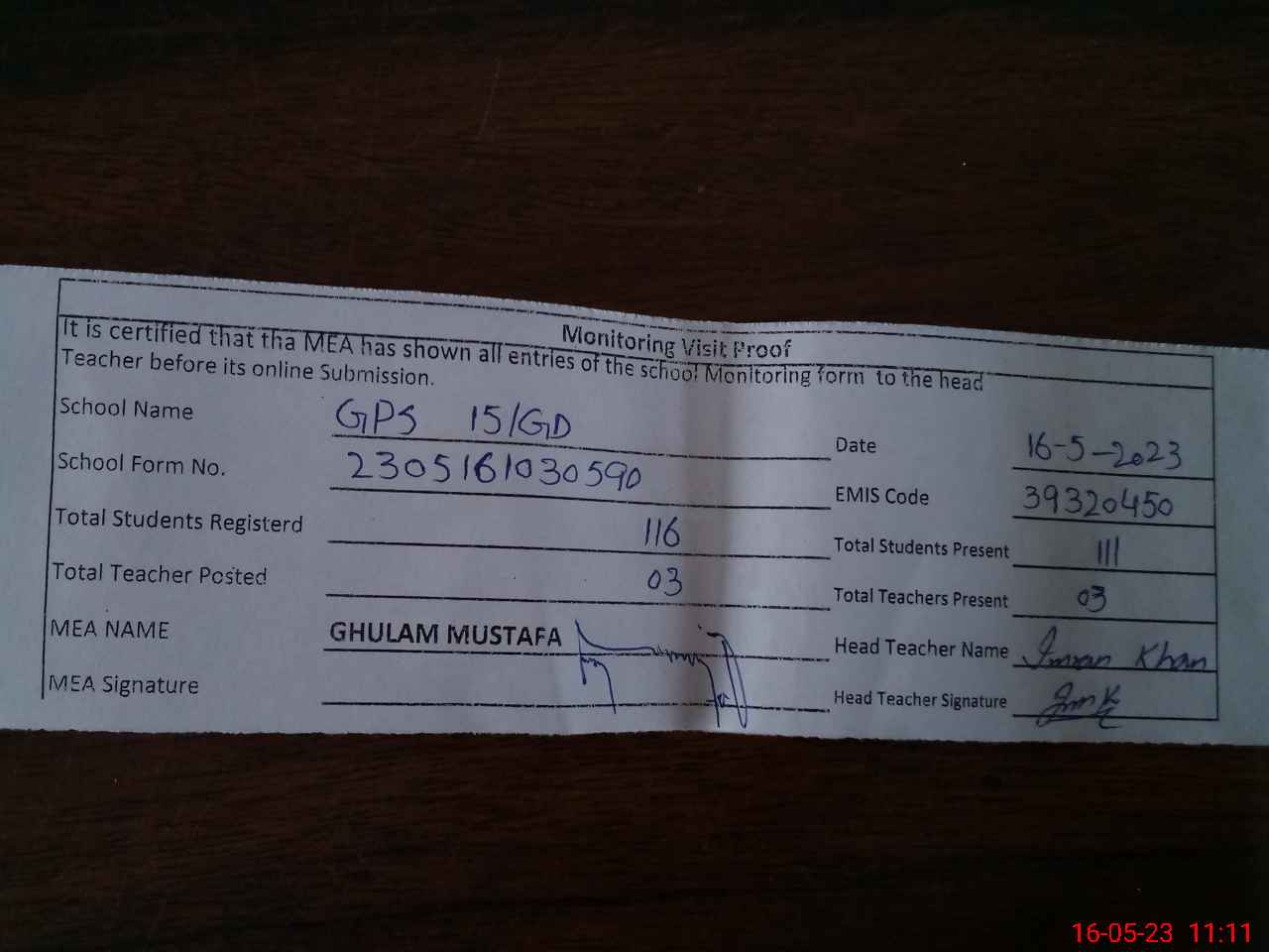 | EMIS Code: 39320450 | Name of School: GES CHAK NO. 15/G.D | |||