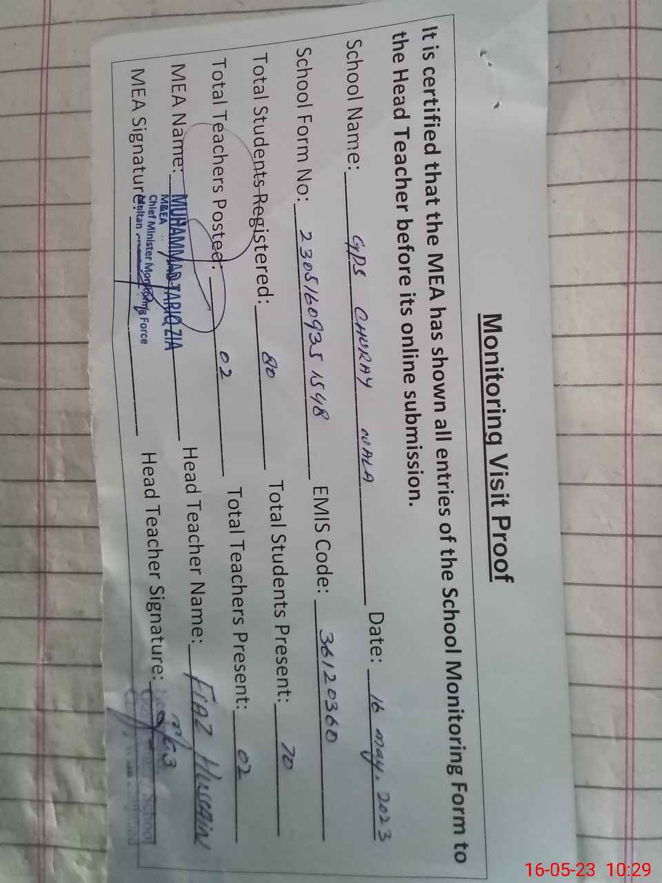 | Attendance Register | Head Teacher | MEA with School | Visit Proof |