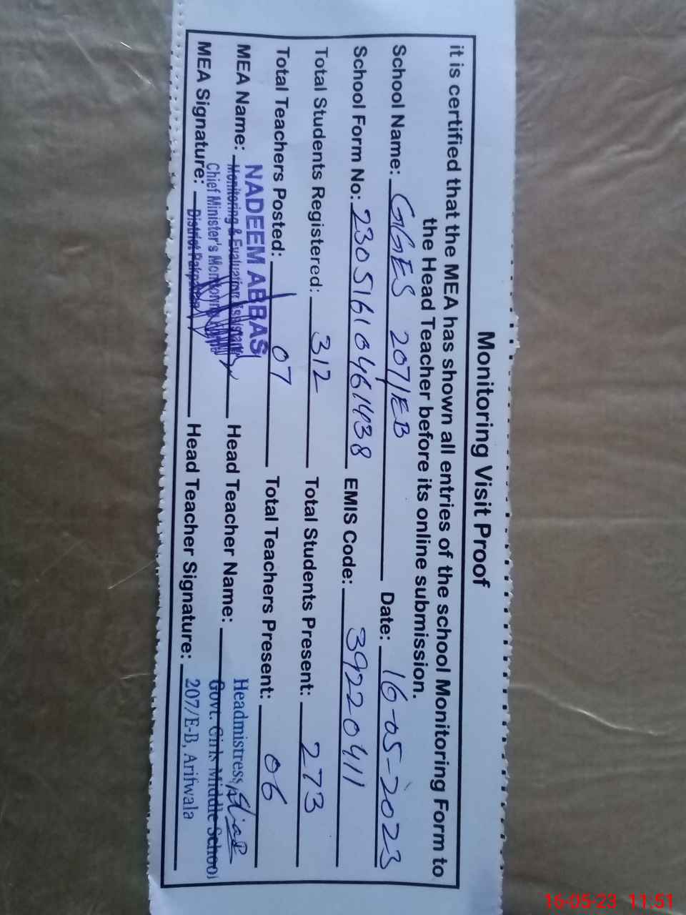 | Certified that this School was Inspected by the Undersigned MEA/DMO Today and the Information Stated Above is as Per Record. | |||||