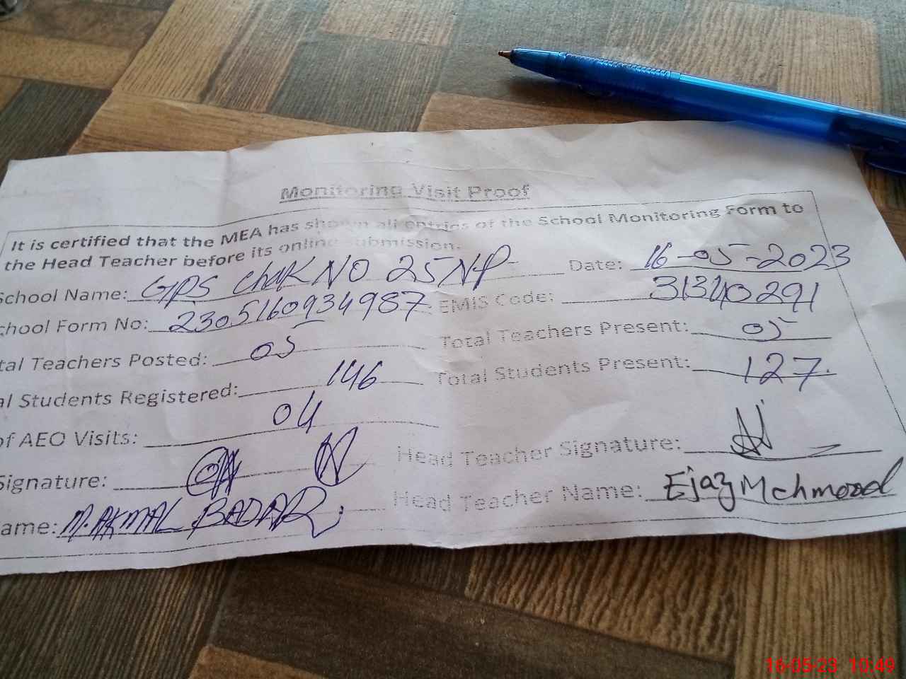 | Attendance Register | Head Teacher | MEA with School | Visit Proof |
