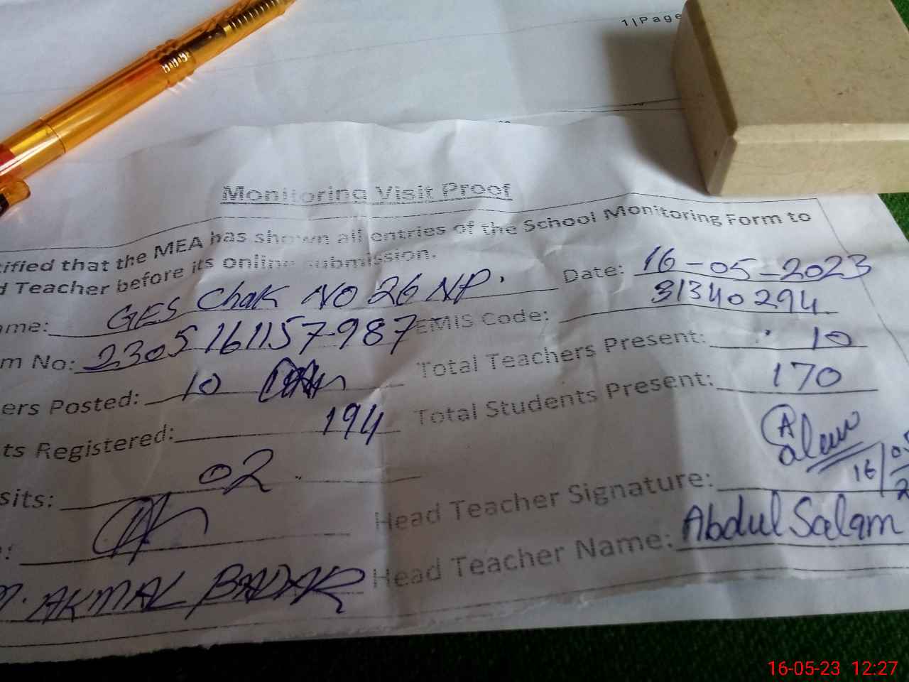 | EMIS Code: 31340294 | Name of School: GES CHAK NO. 26 NP | |||
