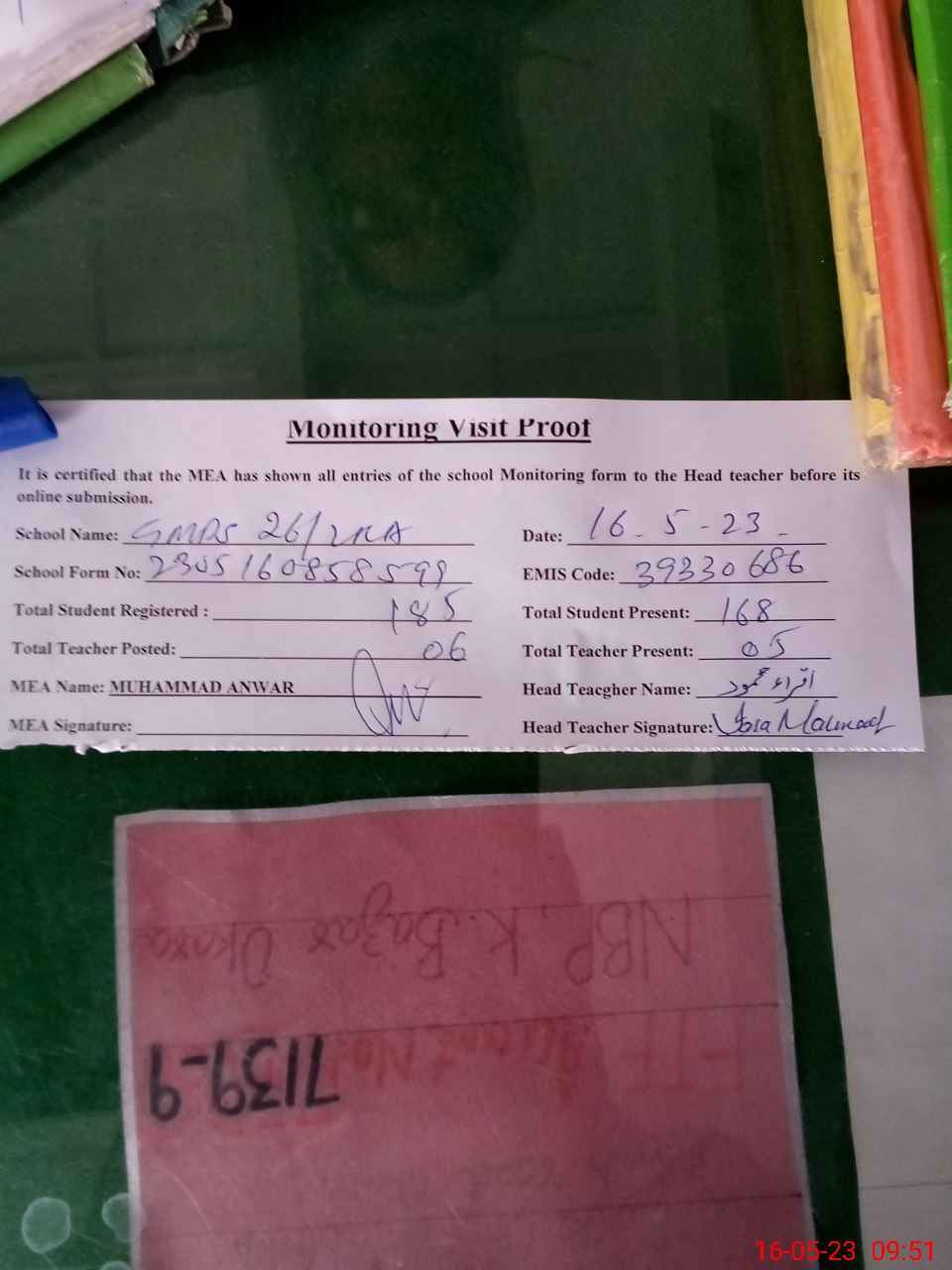 | Attendance Register | Head Teacher | MEA with School | Visit Proof |