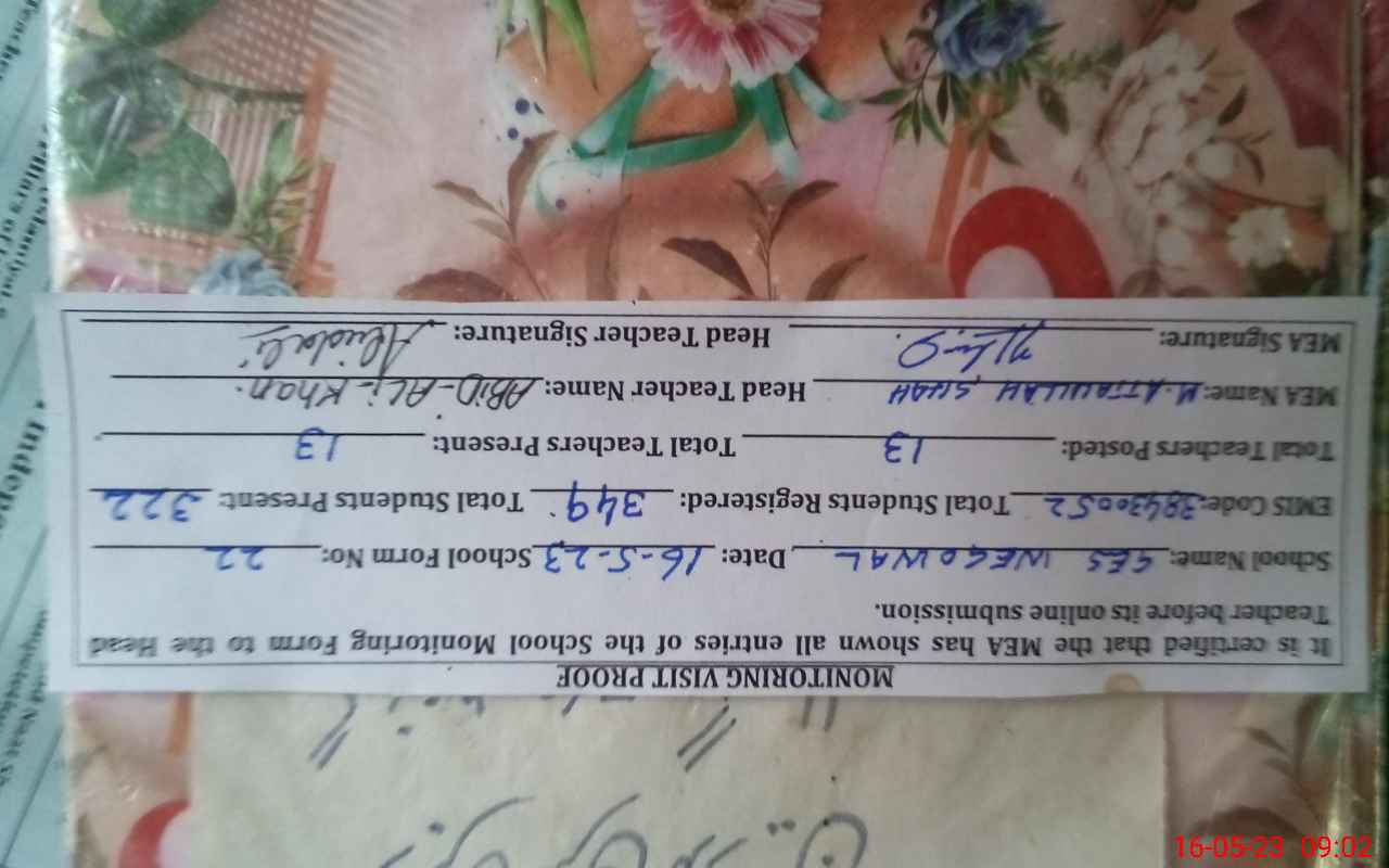 | Certified that this School was Inspected by the Undersigned MEA/DMO Today and the Information Stated Above is as Per Record. | |||||
