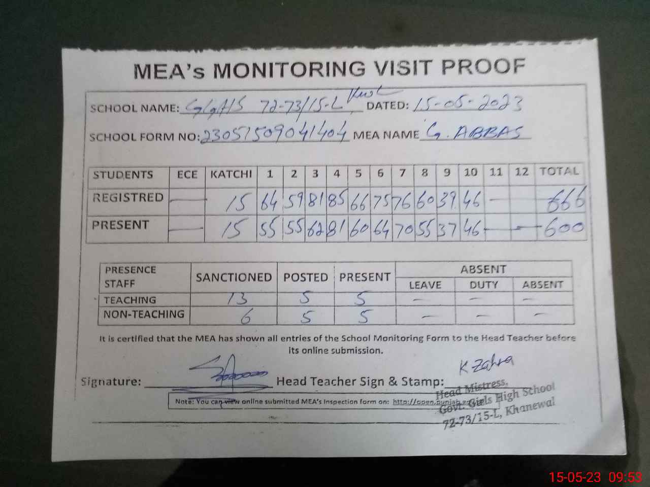 | Attendance Register | Head Teacher | MEA with School | Visit Proof |