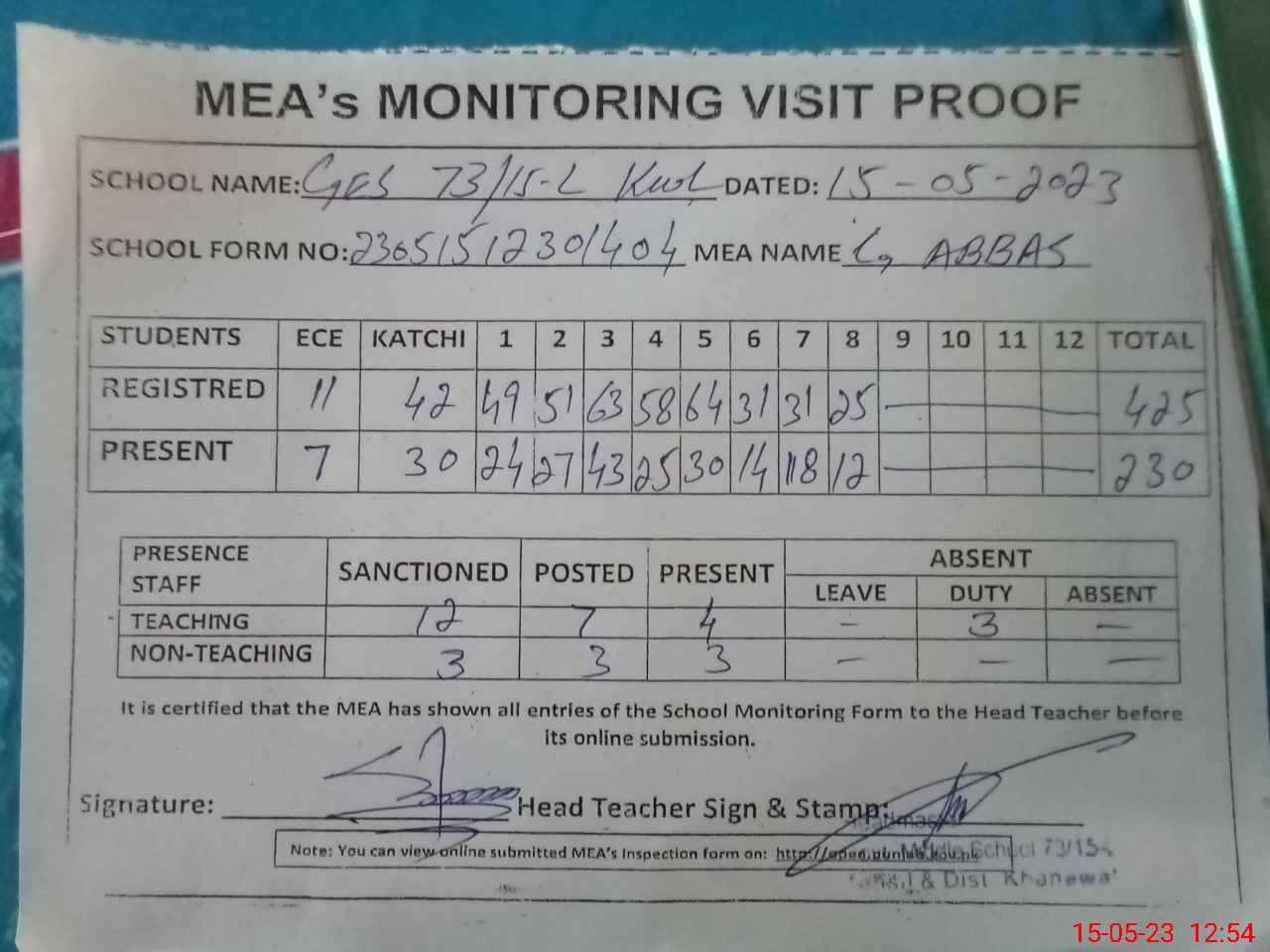 | Attendance Register | Head Teacher | MEA with School | Visit Proof |