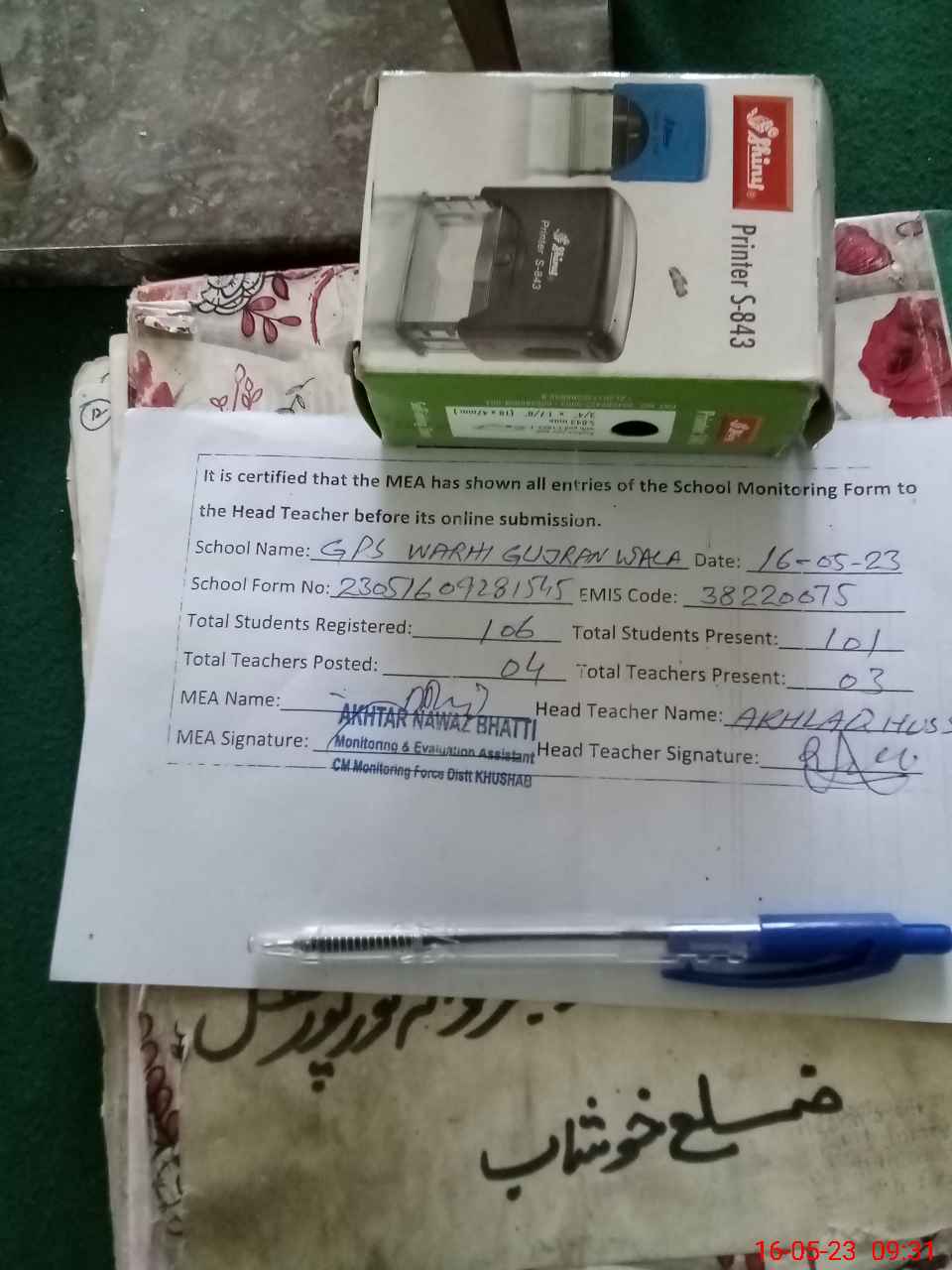 | Certified that this School was Inspected by the Undersigned MEA/DMO Today and the Information Stated Above is as Per Record. | |||||