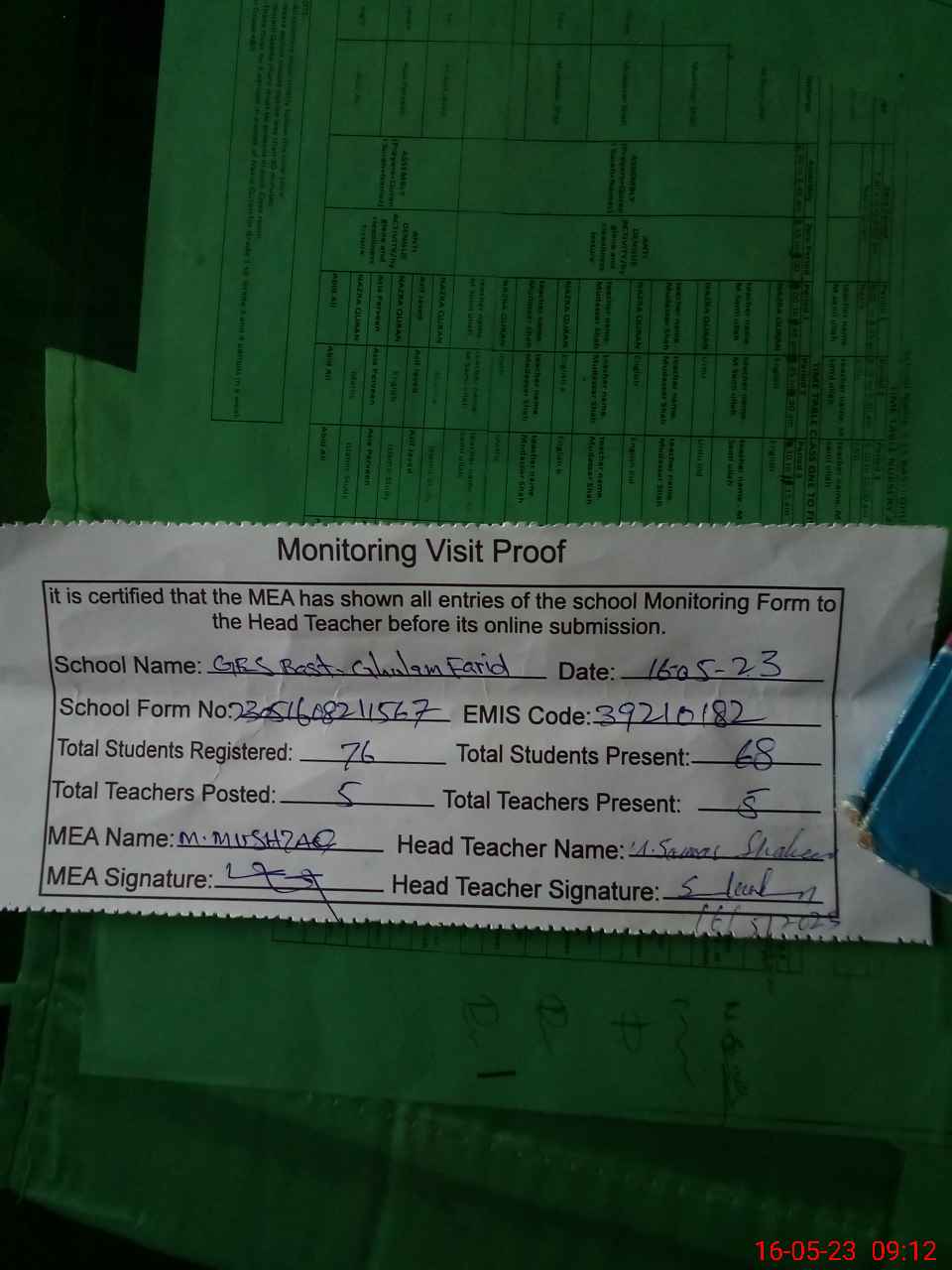 | Attendance Register | Head Teacher | MEA with School | Visit Proof |