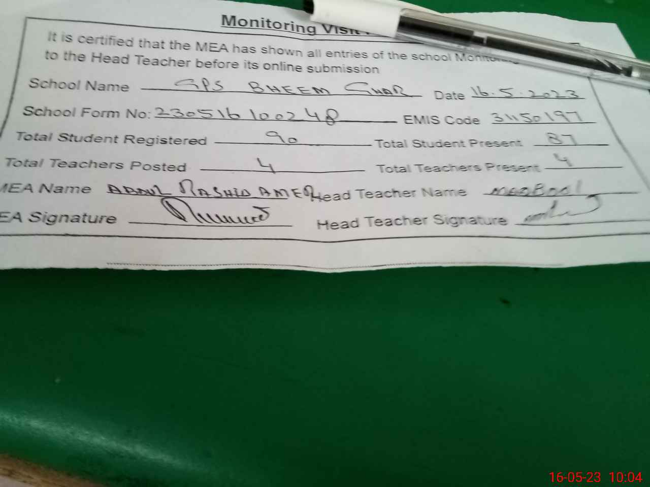 | Attendance Register | Head Teacher | MEA with School | Visit Proof |
