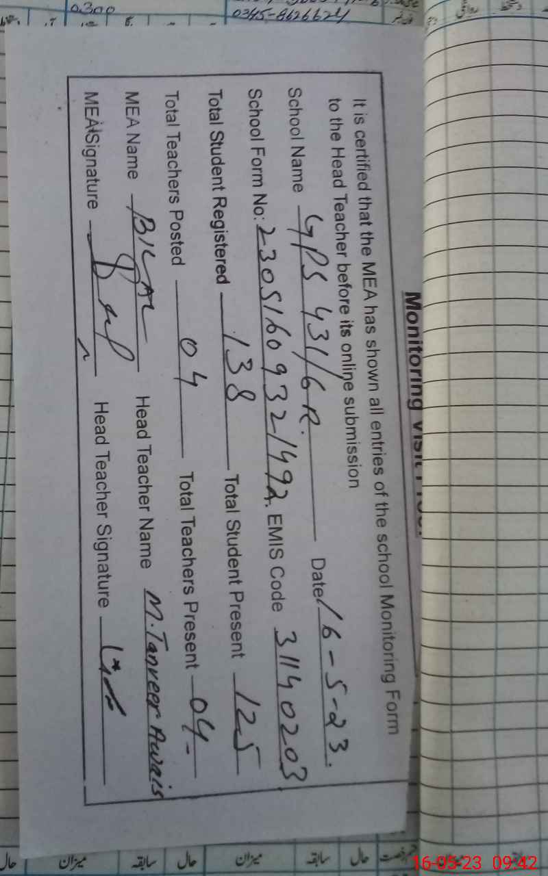 | EMIS Code: 31140203 | Name of School: GPS CHAK NO 431/6-R | |||