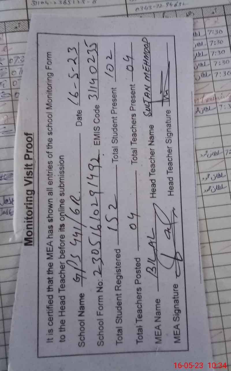 | Attendance Register | Head Teacher | MEA with School | Visit Proof |