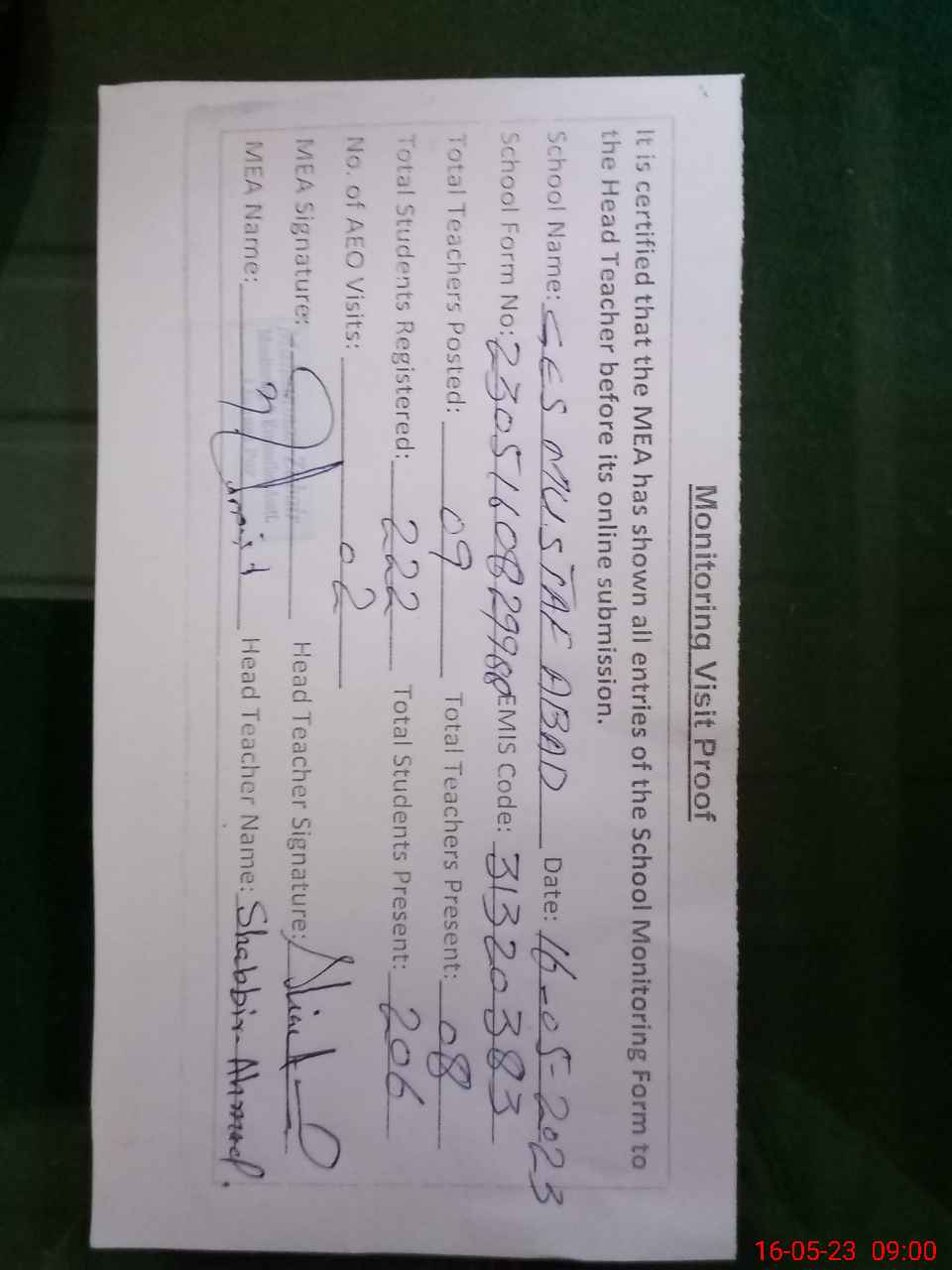 | Certified that this School was Inspected by the Undersigned MEA/DMO Today and the Information Stated Above is as Per Record. | |||||