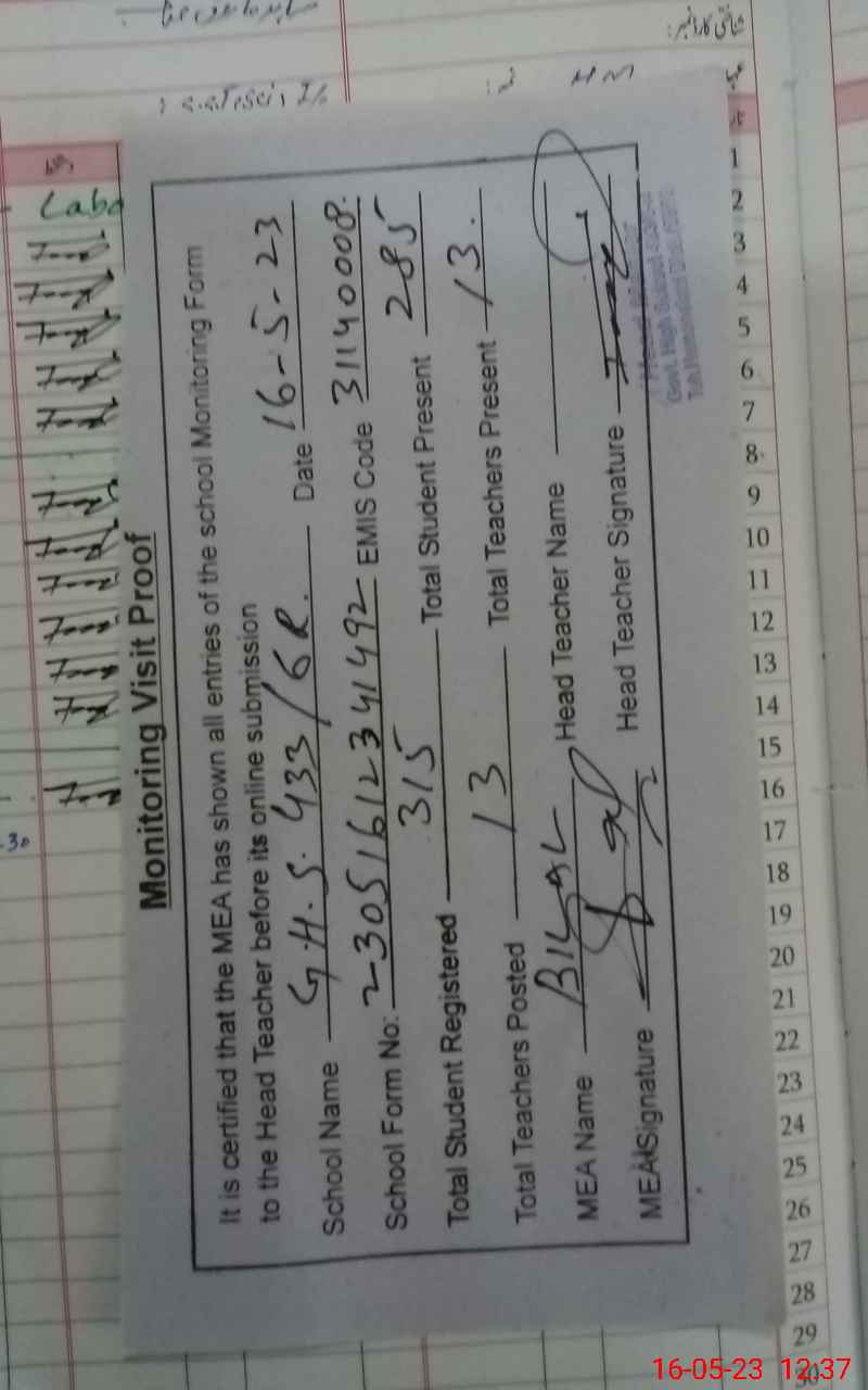 | EMIS Code: 31140008 | Name of School: GHS CHAK NO. 433/6-R | |||