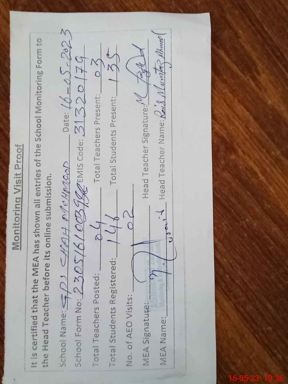 | Attendance Register | Head Teacher | MEA with School | Visit Proof |