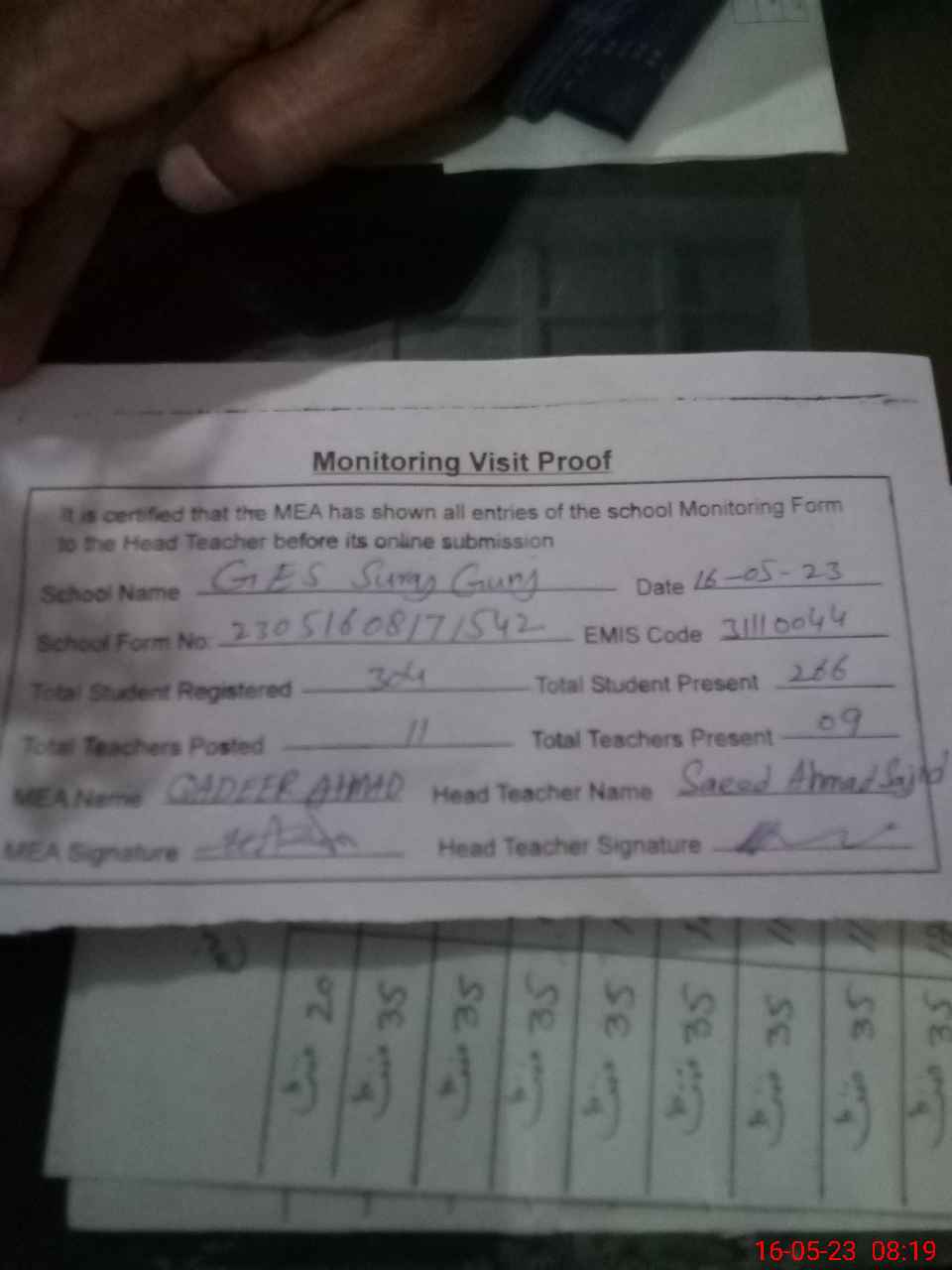| Attendance Register | Head Teacher | MEA with School | Visit Proof |