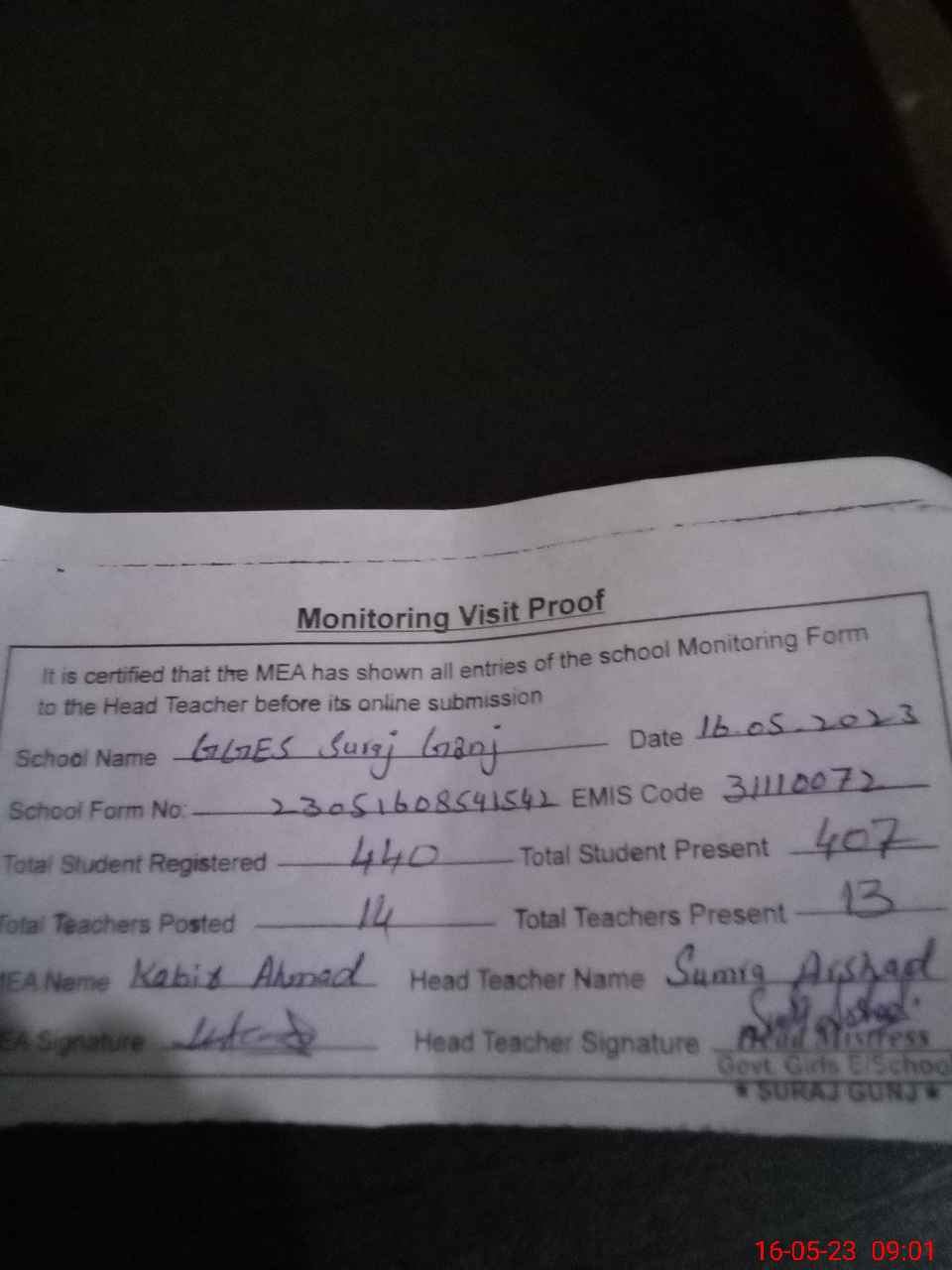 | Attendance Register | Head Teacher | MEA with School | Visit Proof |