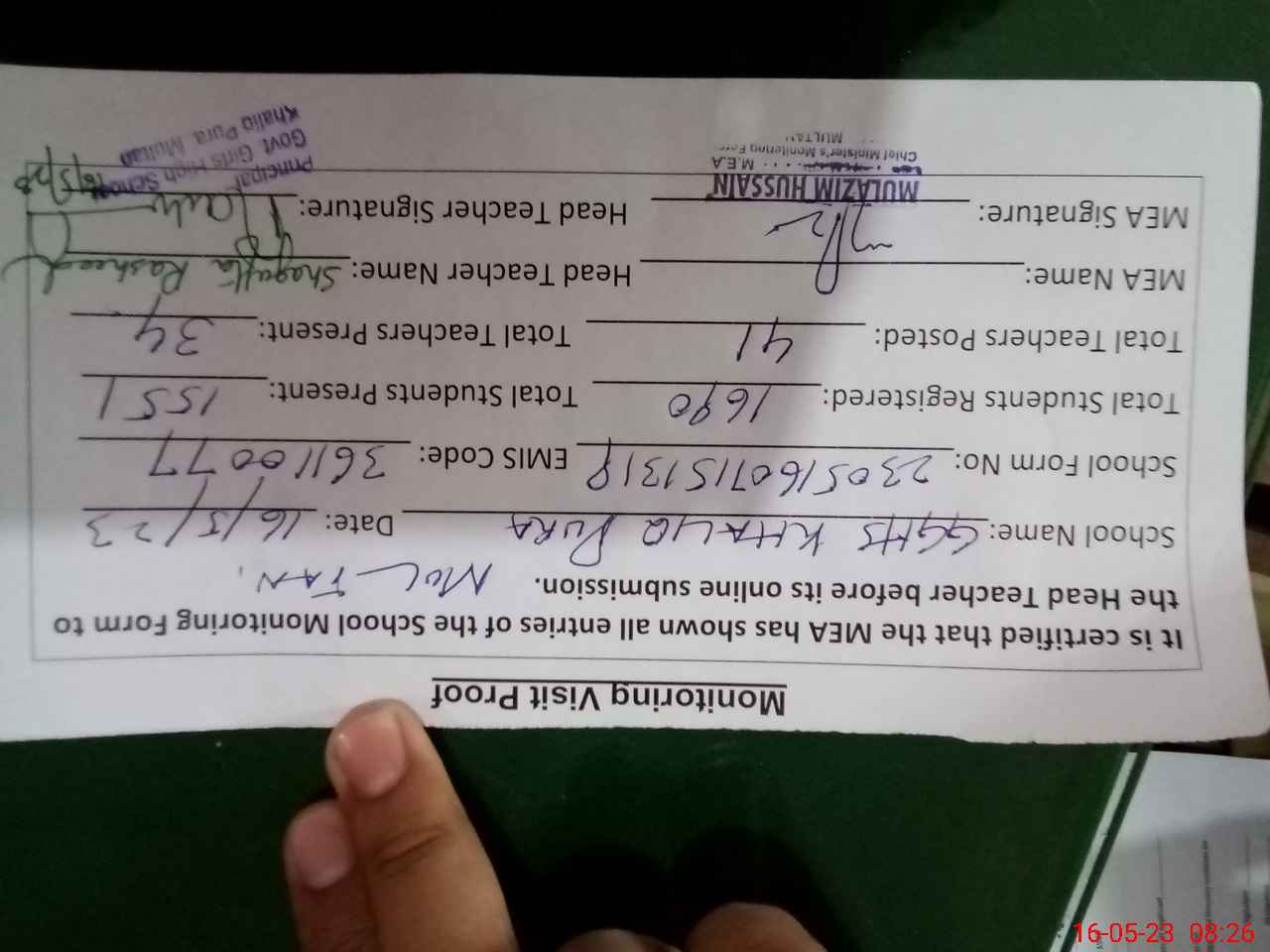 | Certified that this School was Inspected by the Undersigned MEA/DMO Today and the Information Stated Above is as Per Record. | |||||