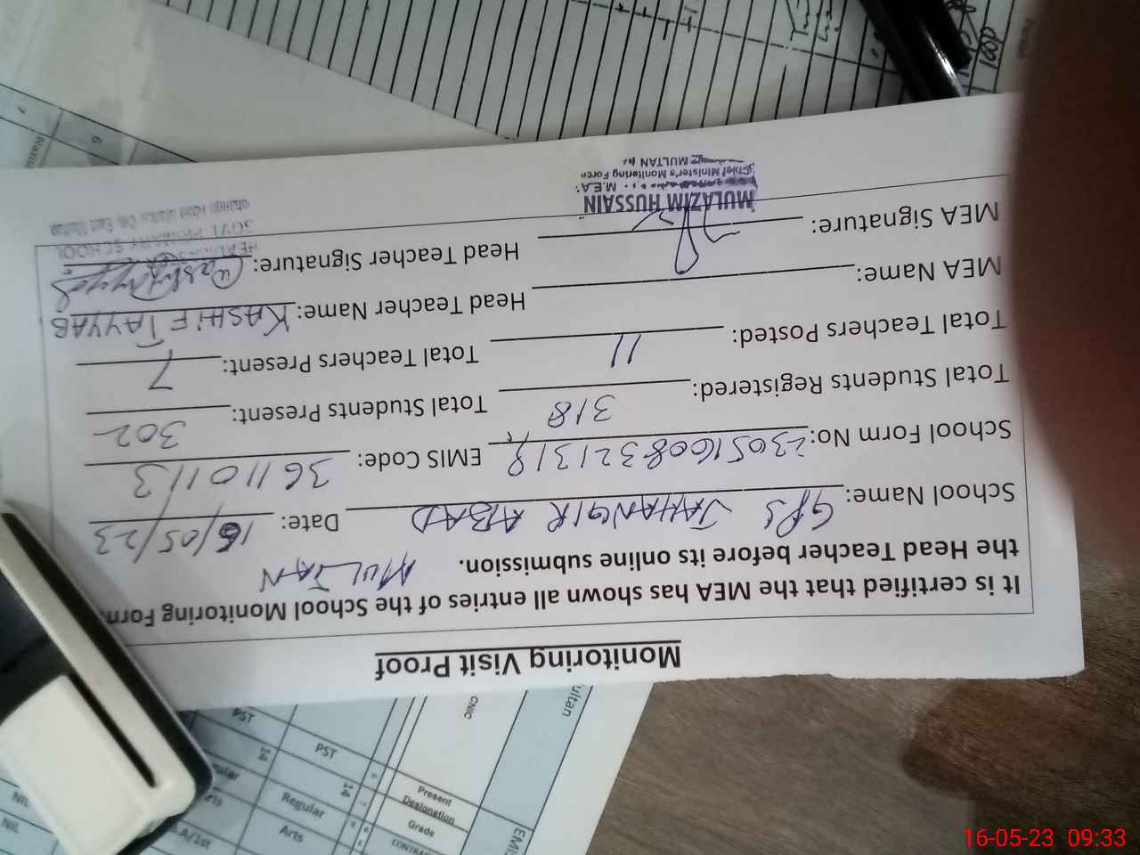 | Attendance Register | Head Teacher | MEA with School | Visit Proof |