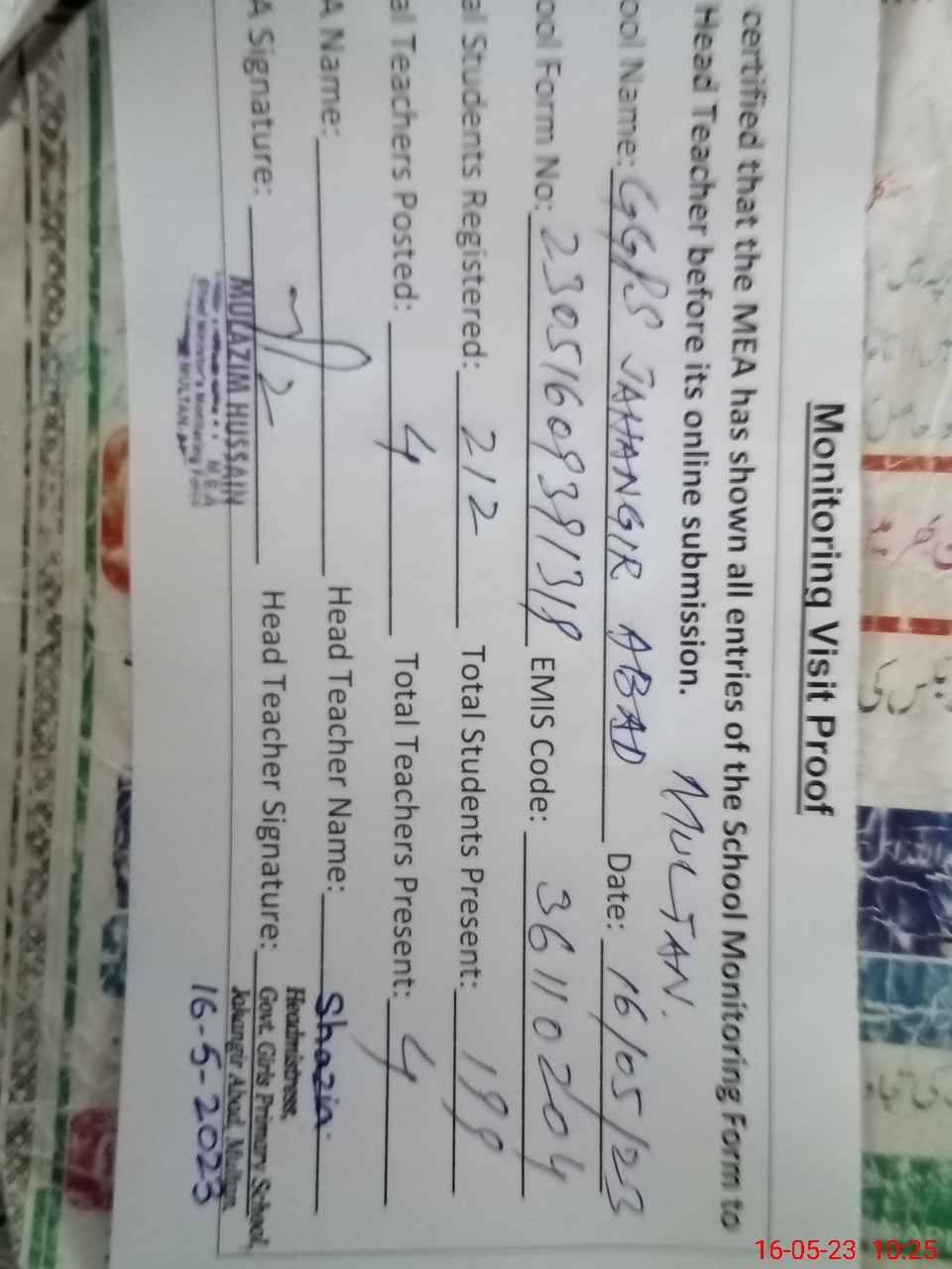 | Attendance Register | Head Teacher | MEA with School | Visit Proof |