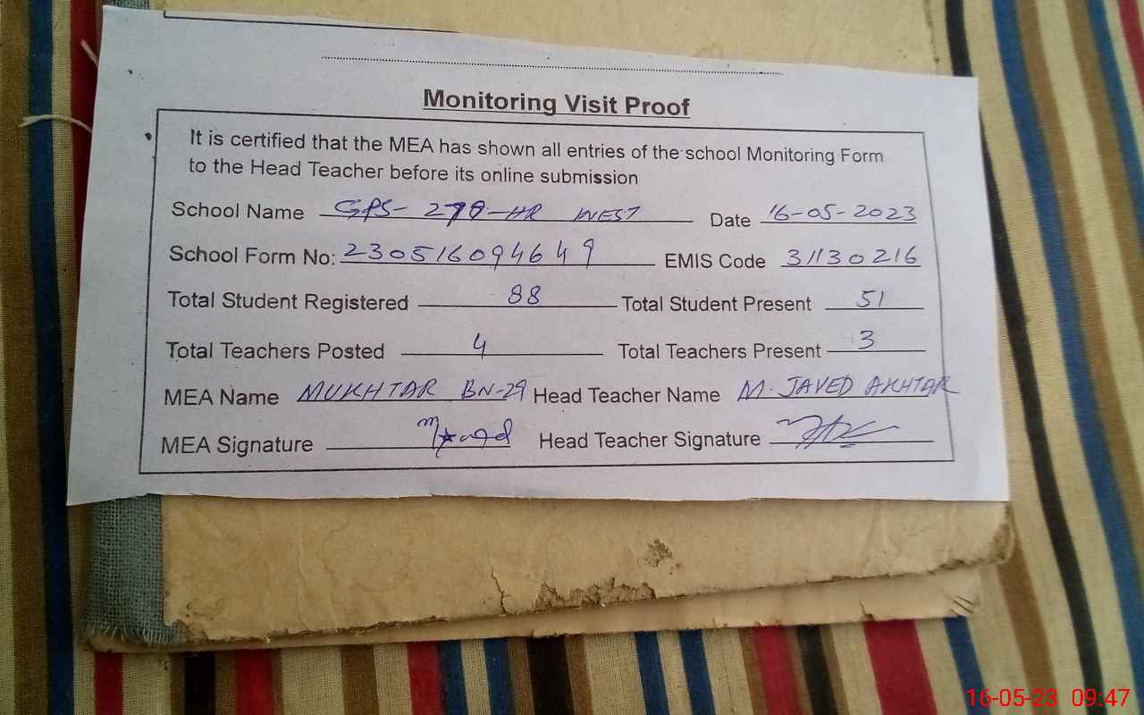 | EMIS Code: 31130216 | Name of School: GPS CHAK NO 278 HR W | |||