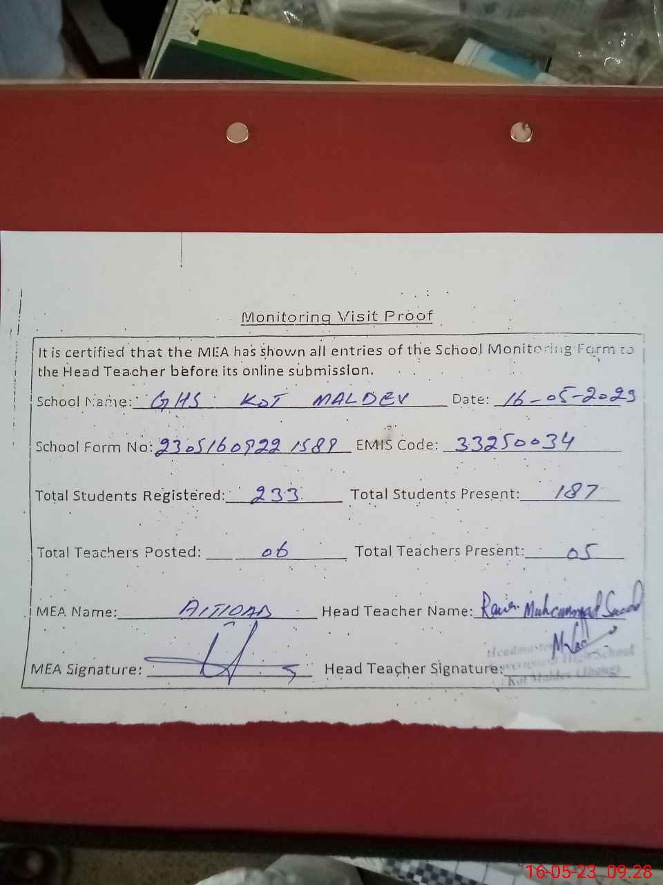 | Attendance Register | Head Teacher | MEA with School | Visit Proof |