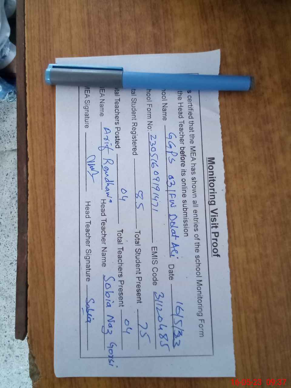 | Attendance Register | Head Teacher | MEA with School | Visit Proof |