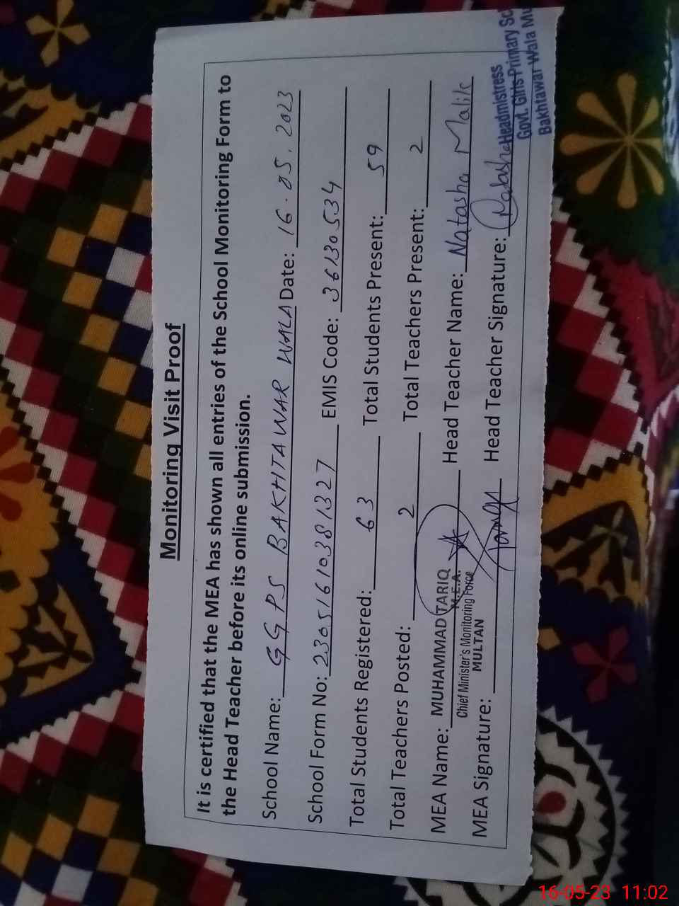| Attendance Register | Head Teacher | MEA with School | Visit Proof |