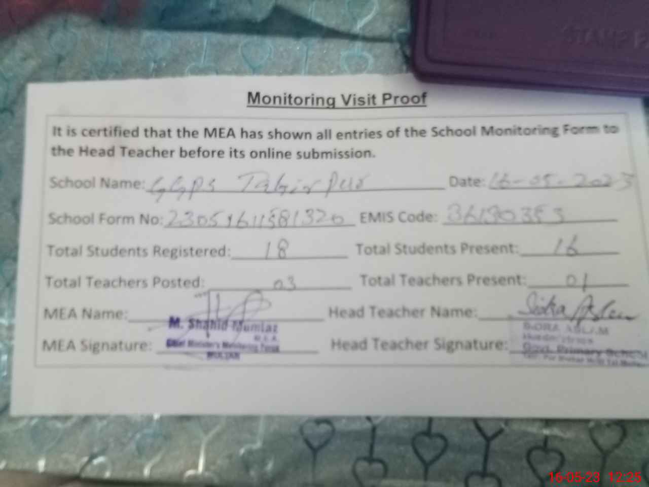 | Attendance Register | Head Teacher | MEA with School | Visit Proof |