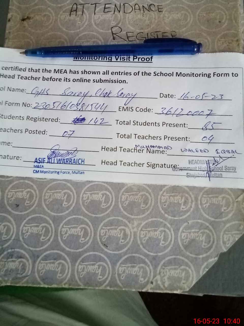 | Attendance Register | Head Teacher | MEA with School | Visit Proof |