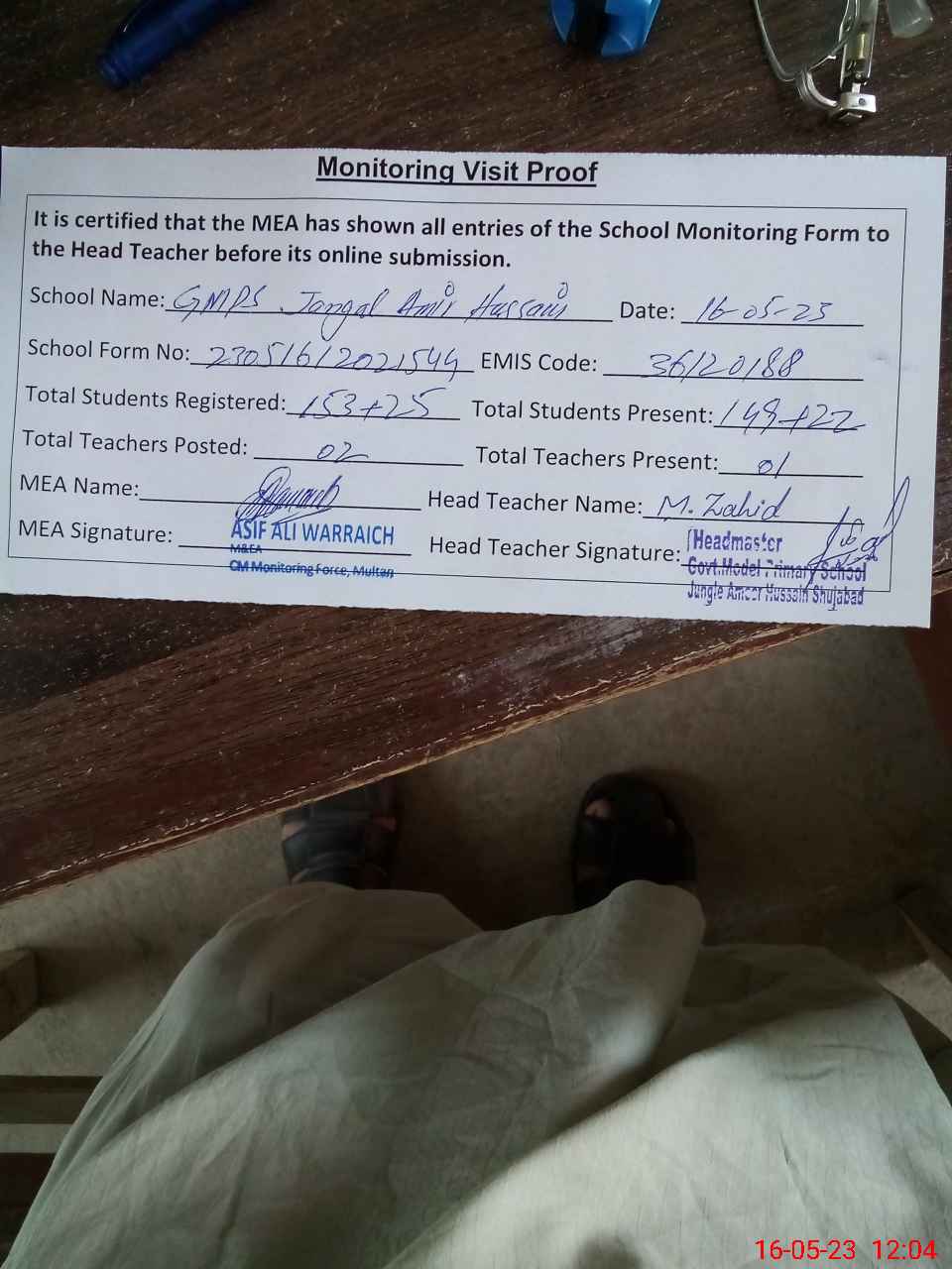 | Attendance Register | Head Teacher | MEA with School | Visit Proof |