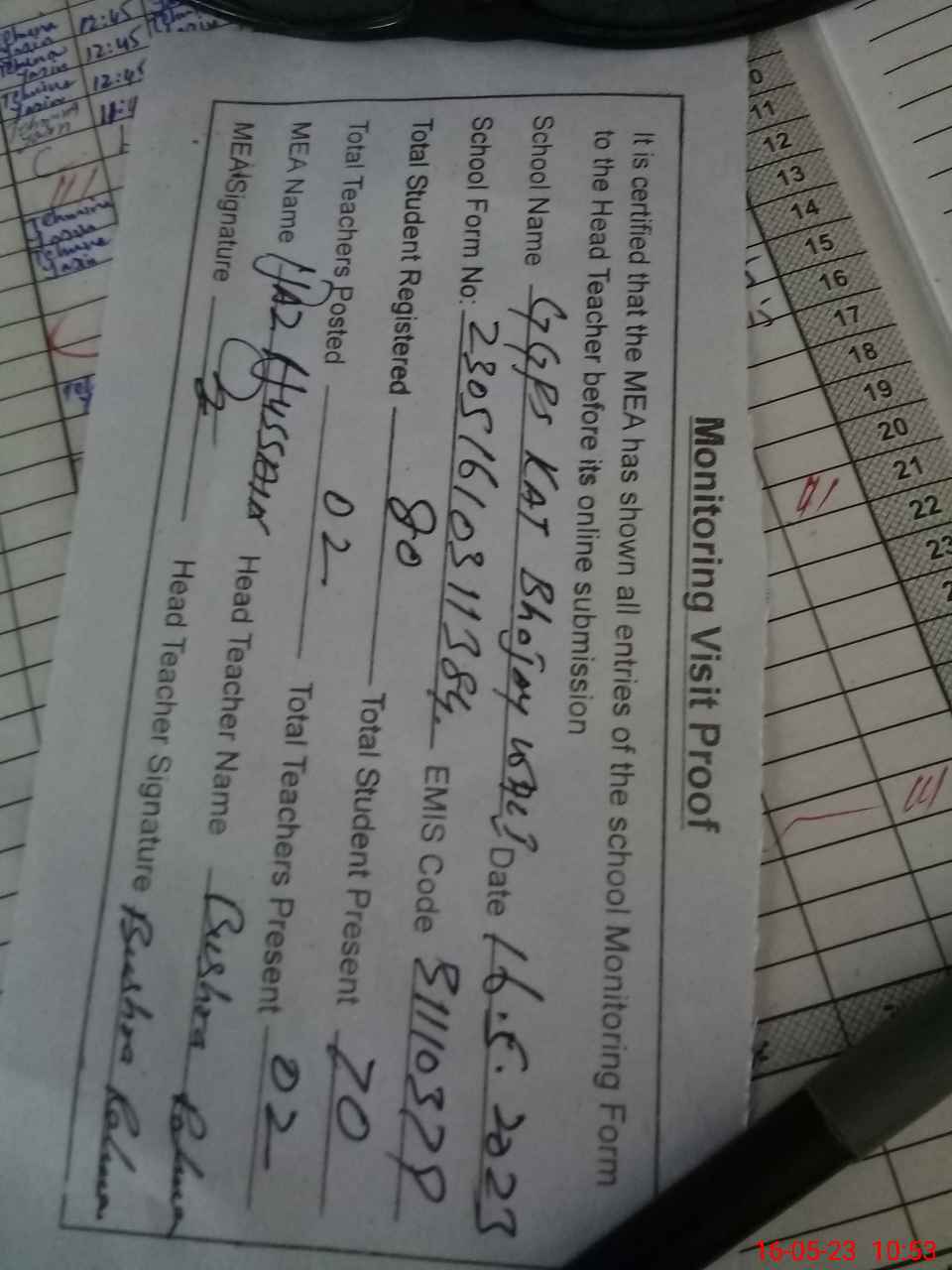 | Attendance Register | Head Teacher | MEA with School | Visit Proof |