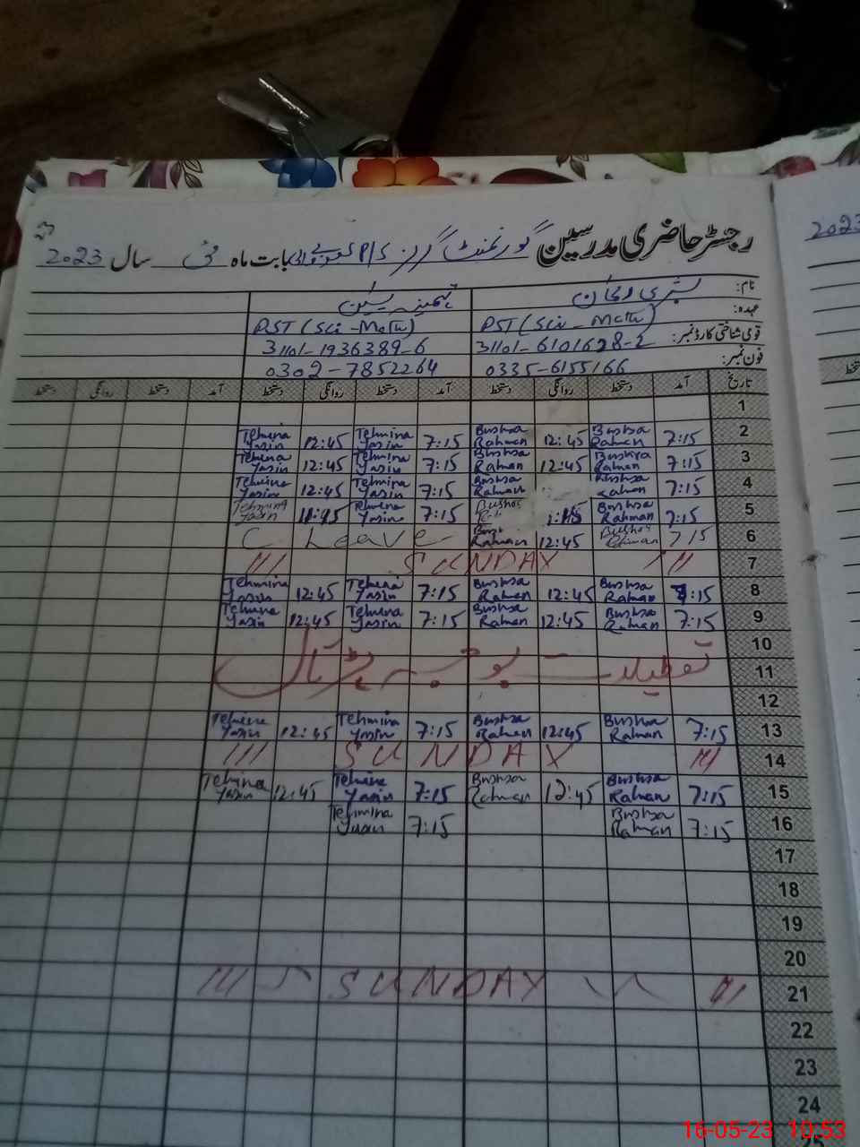 | CNIC | Full Name | Designation | R/C | Absence During Last Calender Month |