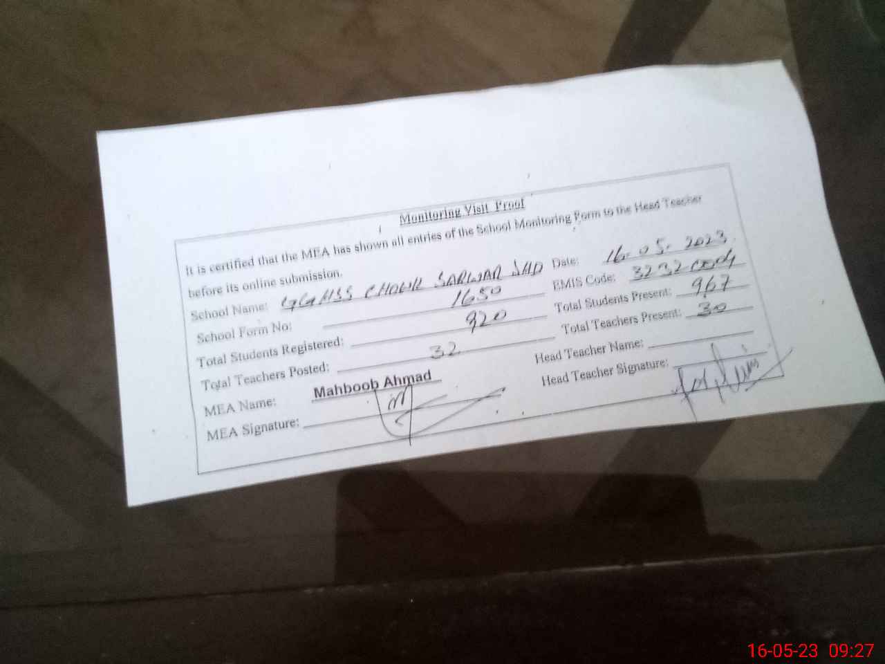 | Attendance Register | Head Teacher | MEA with School | Visit Proof |