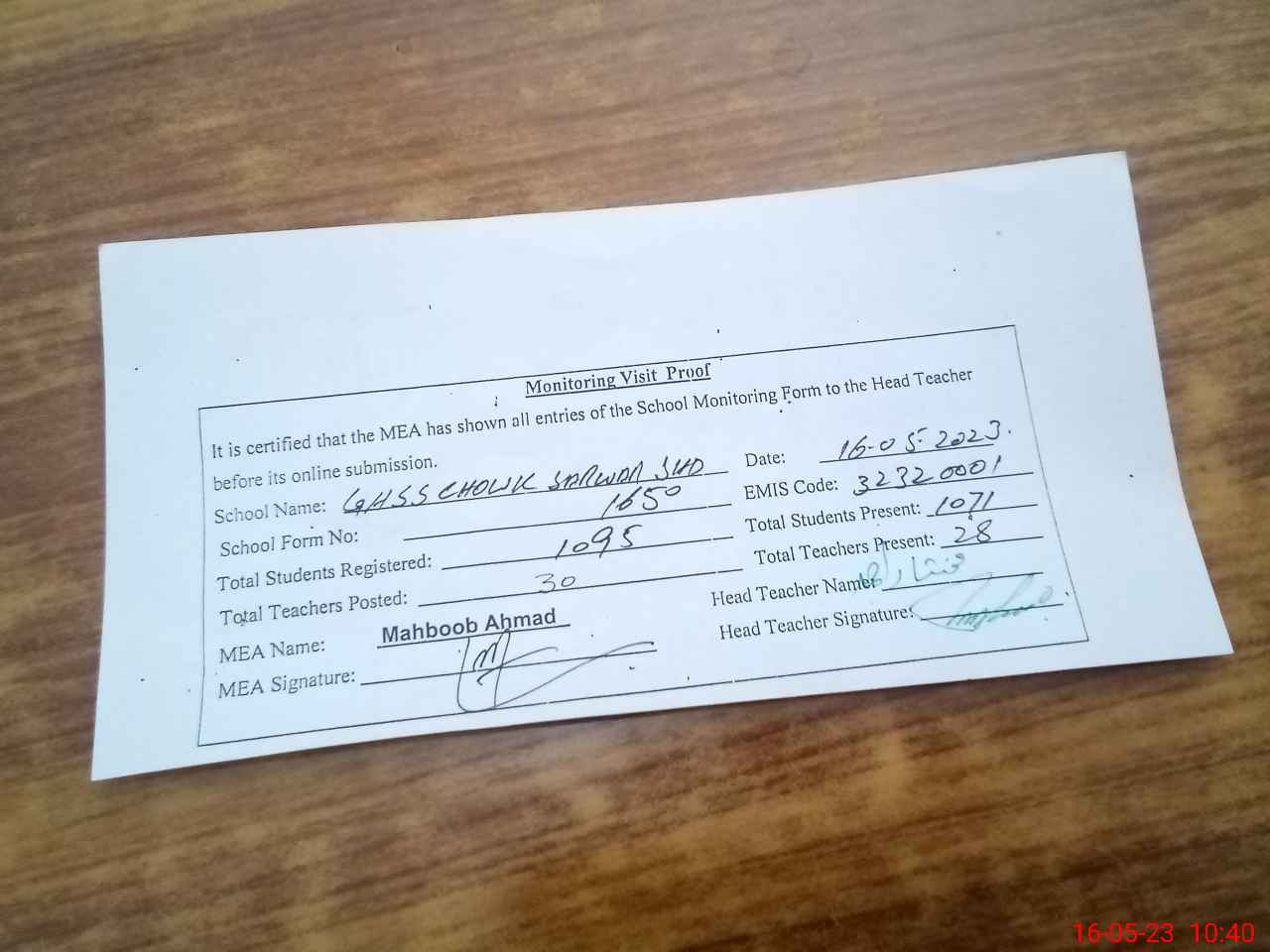 | Attendance Register | Head Teacher | MEA with School | Visit Proof |