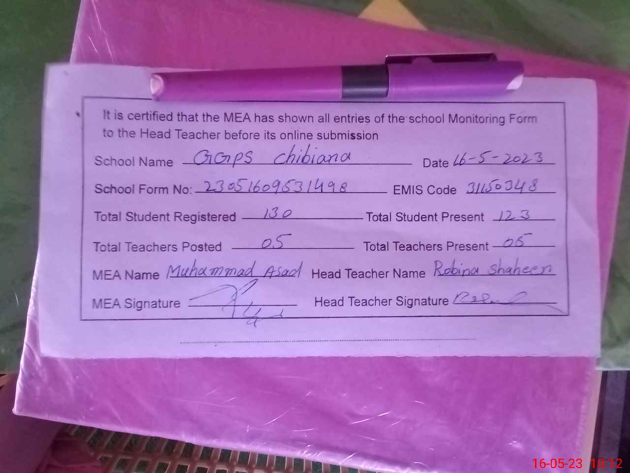 | Attendance Register | Head Teacher | MEA with School | Visit Proof |