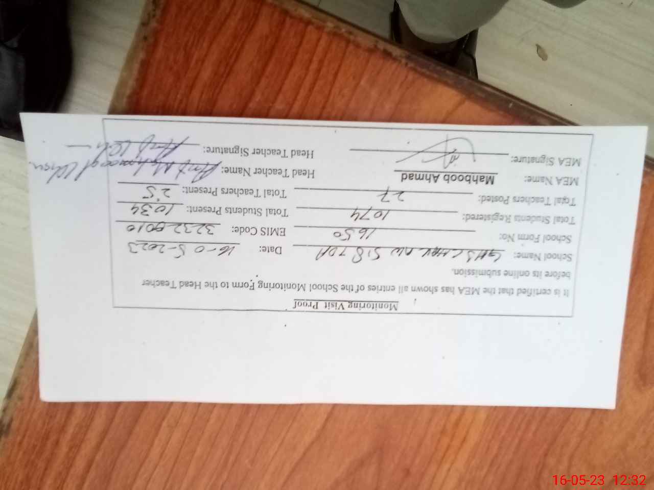 | Name: MIR**** AH**** Designation: (School Headmaster's/Headmistress's) SR.HM Phone/Cell Number: 03**** |